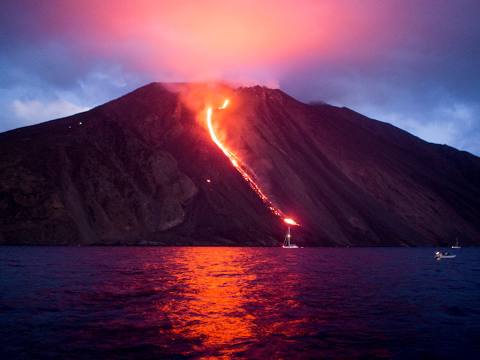 Estrômboli é uma pequena ilha ao norte da costa da Sicília e nela se localiza um dos três vulcões em atividade da Itália